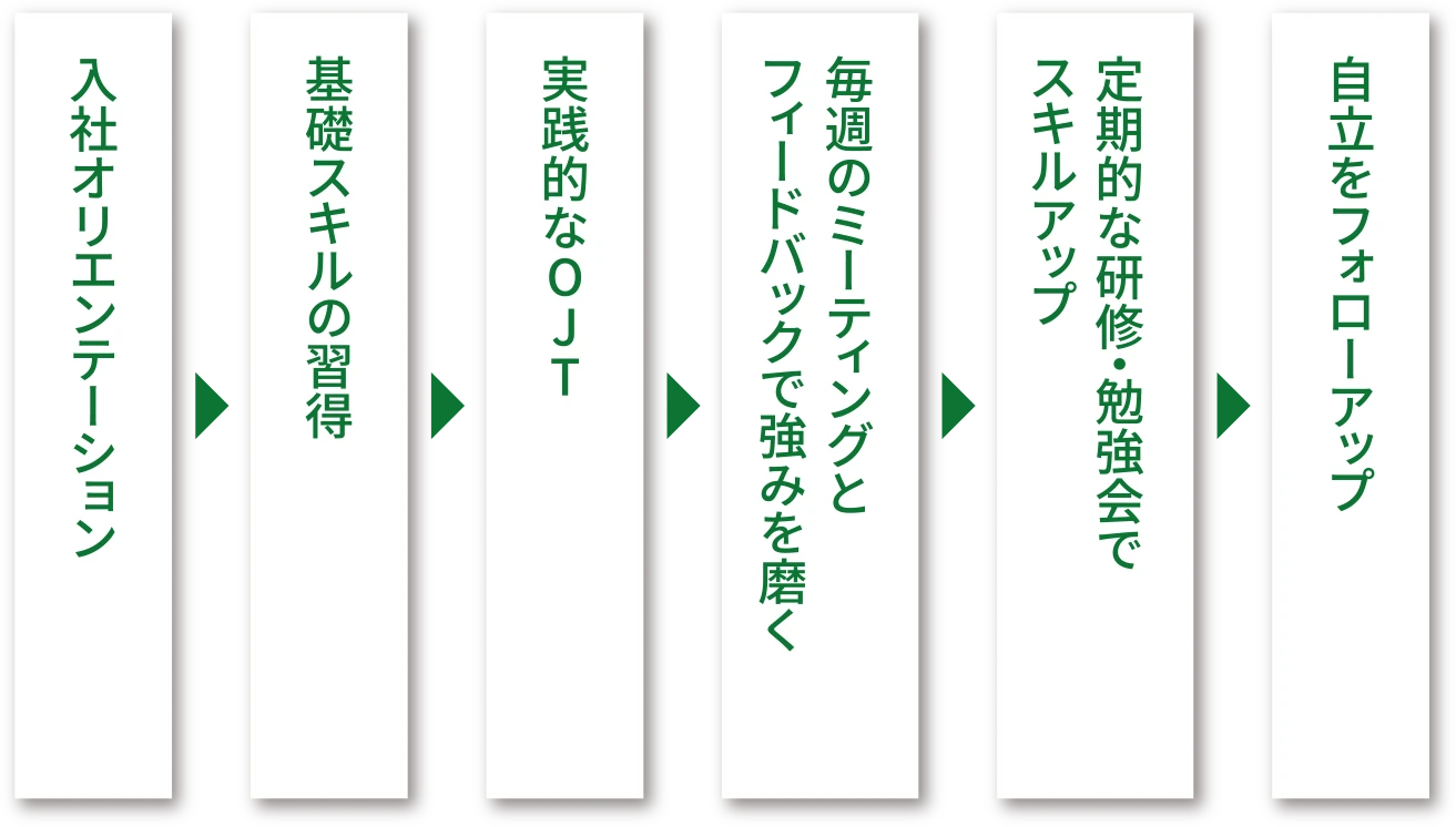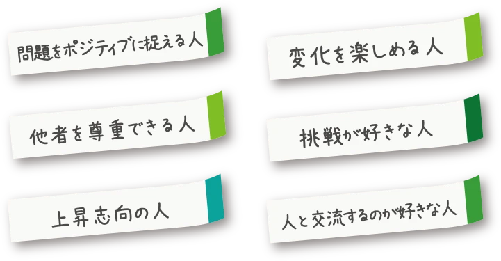 「何ができるか」よりも、「何ができるようになりたいか」という入社後の意欲を重視して人材を採用しています。そのため、前向きな姿勢で仕事に取り組む向上心の高い人材が集まり、結果として優れたチームワークを発揮。会社の成長スピードも高まっています。