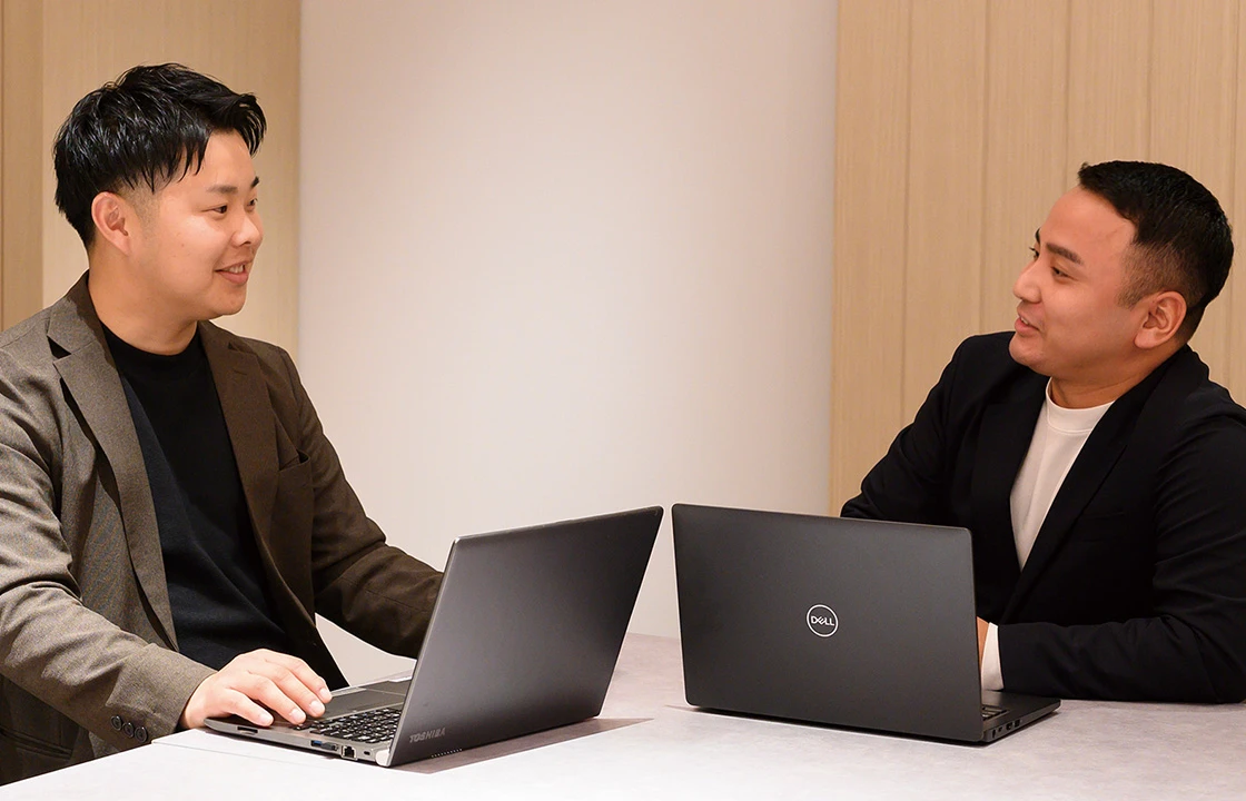 前職の製造業とは違い、キノリンは効率良く成果を上げることを重視。研修が充実していて、未経験でも不安を感じません。東京支店への社内留学では、様々な先輩の仕事術を学べました。筋トレ仲間でもある取締役の佐々木さんをはじめ、年齢や立場を超えて教え合う風土があり、メキメキ力がついていきます。