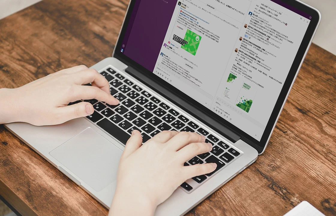 メンバーとの連絡にSlackを活用。オープンチャンネル上に仕事の過程を記載し全社員が閲覧可能です。他事業所の働きに刺激を受け、各拠点が切磋琢磨しながら仕事に打ち込める環境を構築しています。